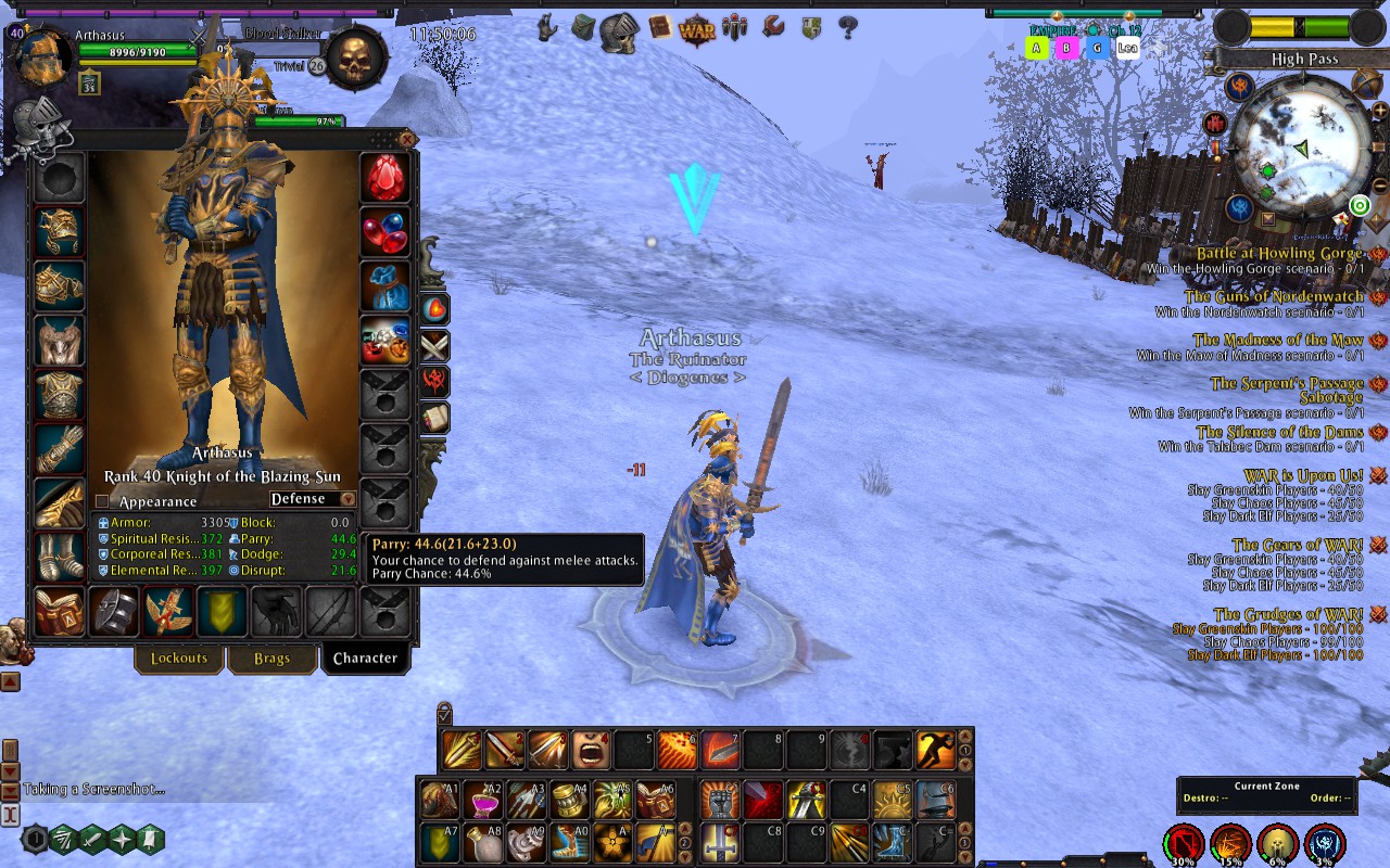 This is true, but if enemy are blowing this much on you to take you down, then either your group is dead already, or you are holding them up while your group kites away, or they are just wasting stuff on you that could be better off used elsewhere. Not disagreeing with you on what armor brings to the table, but in a 6 man you wont need so much. I slot def talis in my gear, armor and ini, and have 40% parry for the runefang proc (50% with weapon proc). I run the str aura, resists and health/ap regen as a basic set, and use toughness pot. Take KD from middle tree, slice through, plus 10% crit on str aura. the rest is up to your preference, or your groups needs.